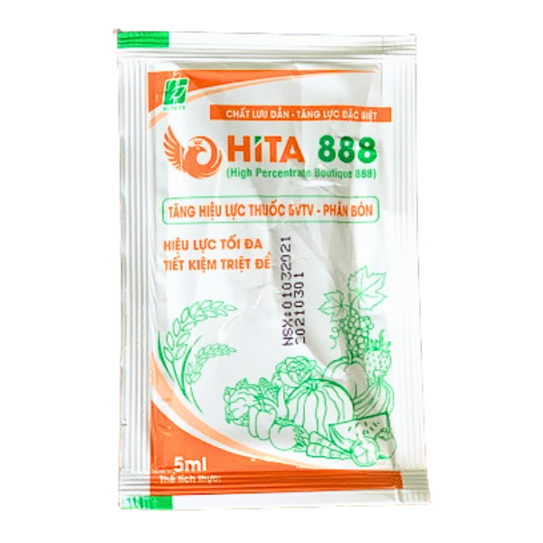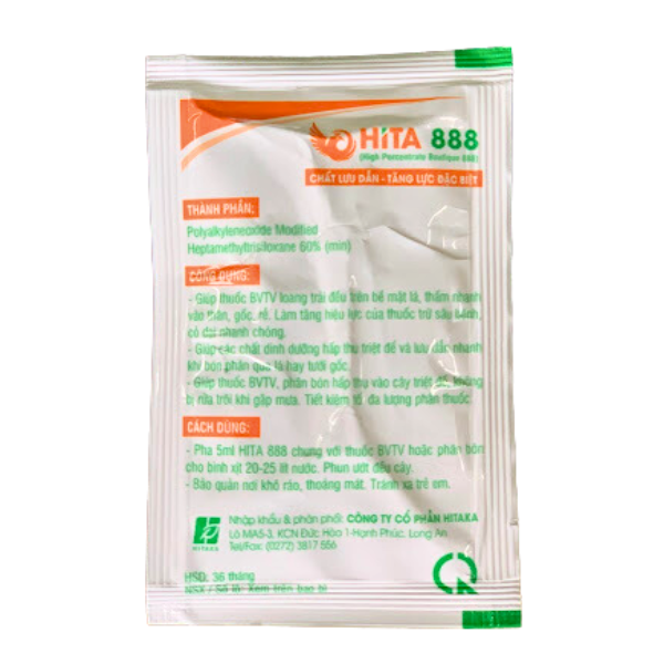 Thuốc Trợ Lực Hita 888 có tác dụng làm loang trãi, thấm sâu trên bề mặt lá. Thuốc giúp tăng hiệu lực của các loại thuốc bảo vệ thực vật, phân bón lá khác. Đặc biệt khi sử dụng với thuốc cỏ.