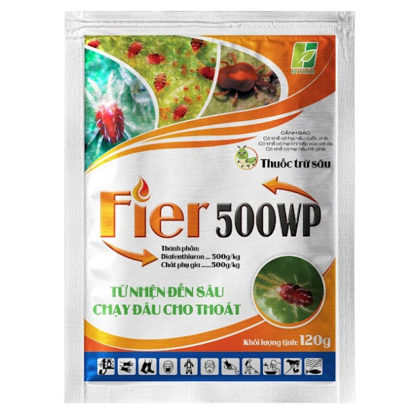 - Fier 500WP Là thuốc diệt nhện thế hệ mới, tác động tiếp xúc, vị độc, xông hơi, thấm sâu nên đặc trị các loại nhện như Nhện Đỏ, Nhện Vàng, Nhện Trắng và sâu vẽ bùa.