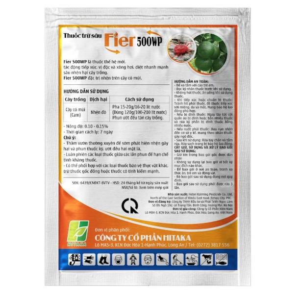 Fier 500WP Là thuốc diệt nhện thế hệ mới, tác động tiếp xúc, vị độc, xông hơi, thấm sâu nên đặc trị các loại nhện như Nhện Đỏ, Nhện Vàng, Nhện Trắng và sâu vẽ bùa.