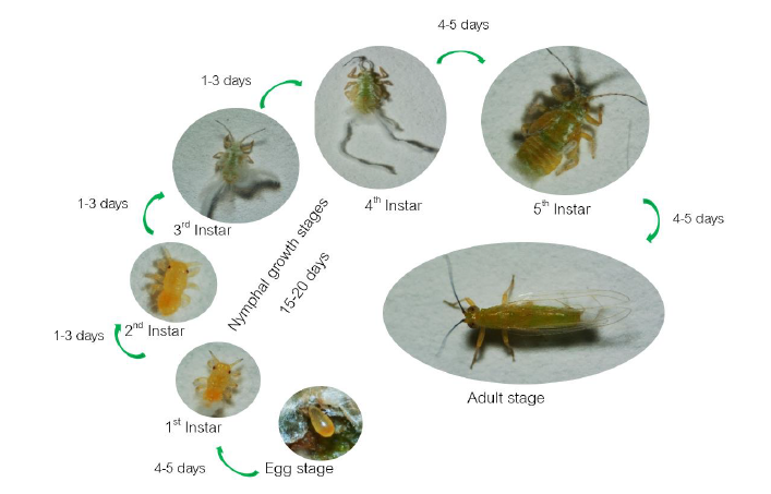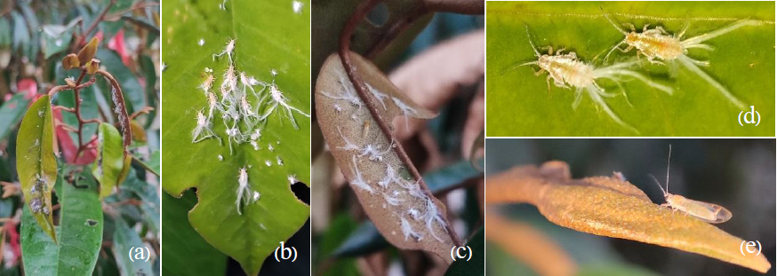 Đáng chú ý, những loài gây hại này không có trên những lá trưởng thành, có màu xanh đậm (Hình 5.7a). Ấu trùng tuổi thứ ba nằm ở bề mặt trên của lá (Hình 5.7b), trong khi ấu trùng tuổi thứ tư được tìm thấy ở bề mặt dưới (Hình 5.7c). Ấu trùng tuổi thứ năm, trông giống như một con gà nhỏ khi phóng to, được xác định trên cả bề mặt trên và dưới của lá non (Hình 5.7d). Khi trưởng thành, rầy nhảy sầu riêng chỉ nhắm vào lá non của cây sầu riêng (Hình 5.7e). Mọi giai đoạn phát triển của ấu trùng và rầy nhảy sầu riêng trưởng thành đều có khả năng xâm nhập vào cây sầu riêng bằng cách hút nhựa từ lá non.