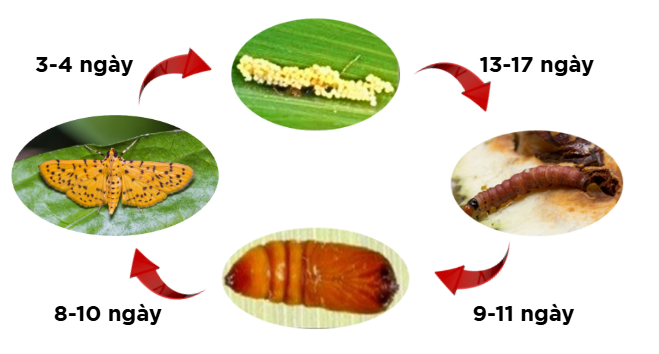 - Giai đoạn nhộng: Thời điểm chuyển giao giữa sâu sang nhộng thì sâu non nhà một lớp kén rồi hóa nhộng bên trong đó. Nhộng ban đầu có màu vàng nâu, sau đó chuyển dần sang màu nâu. Kích thước trung bình của nhộng với chiều dài khoảng 12mm, chiều rộng 2,5mm.